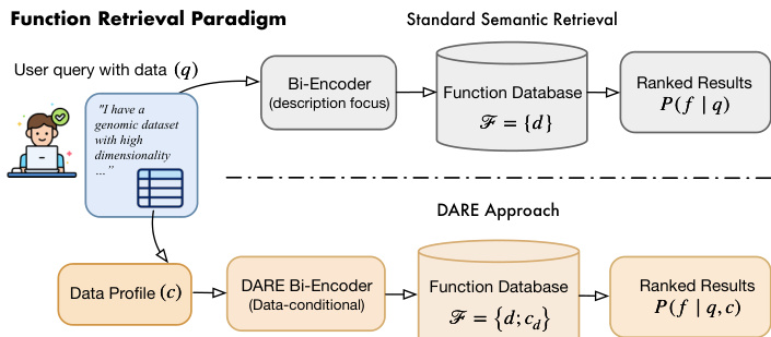 The proposed framework, DARE, addresses the limitations of standard semantic retrieval by incorporating structured data profiles alongside natural language descriptions. As illustrated in the framework diagram, the system contrasts with traditional approaches that rely solely on function descriptions. Instead, DARE conditions the retrieval process on both the user's natural language query and a structured data profile derived from the dataset characteristics.