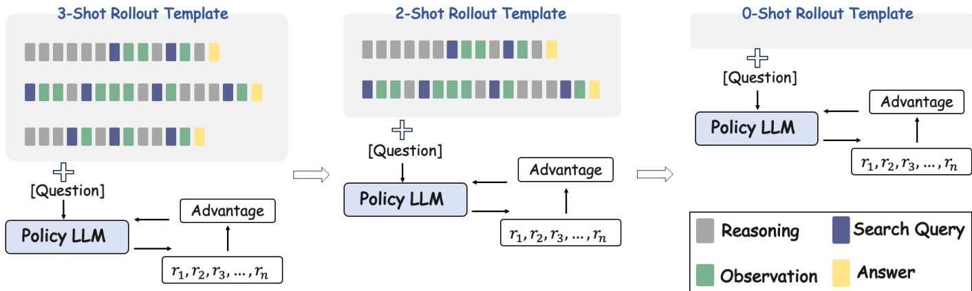 The core innovation of the proposed method, In-Context Reinforcement Learning (ICRL), lies in its training curriculum. Rather than training from scratch or relying solely on static few-shot prompting, ICRL integrates the inductive bias of few-shot learning with the exploration capabilities of RL. The process begins by incorporating a small number of tool-use demonstrations into the rollout template to guide the model. As training progresses and the model acquires tool-use capabilities, the number of demonstration examples in the prompt is iteratively reduced. This transition allows the model to move from imitation to autonomous tool use.