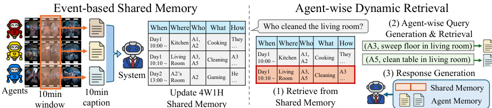 Event-based Shared Memory To achieve a system-level global understanding, the system aggregates fragmented events from multiple agents. At every 10-minute interval, each embodied agent provides a caption summarizing its observations. A centralized manager then integrates these individual captions into a system-level summary. Rather than producing a flat textual condensation, the manager identifies key events across agents and explicitly records the corresponding 4W1H fields: When, What, Where, Who, and How. This produces a coherent global memory that aligns agent perspectives while preserving critical details for reasoning.