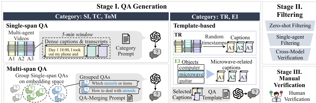 - Open-ended Categories (SI, TC, ToM): The team generates large pools of samples by providing 5-minute video segments with dense captions and transcripts to the model, instructing it to create questions grounded by at least two agents.