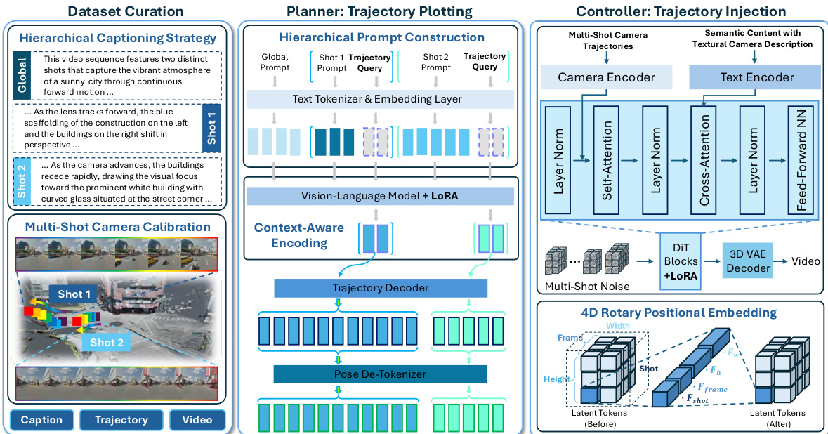 Controller: Trajectory Injection The Controller module renders the plotted trajectories into high-fidelity multi-shot videos by modeling P(Video∣Caption,Trajectory). It utilizes a holistic Diffusion Transformer (DiT) backbone. To ensure precise adherence to the camera paths, the authors implement a Camera Encoder that projects the extrinsic matrix of each frame into a feature vector. This camera embedding is directly added to the intermediate visual features before the self-attention layer, enforcing geometric adherence without disrupting pre-trained priors.