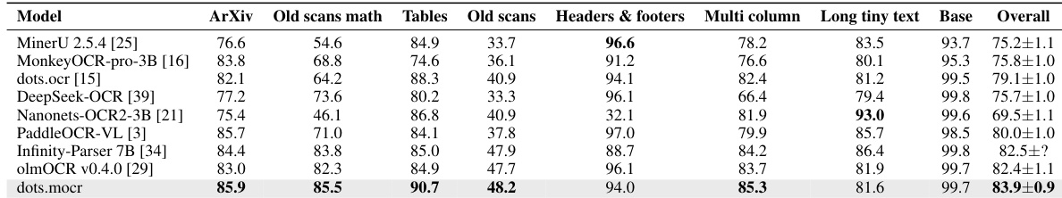 The authors evaluate document parsing performance across various specialized categories including ArXiv papers, old mathematical scans, tables, and multi-column layouts. Results show that dots.mocr achieves the highest overall performance among the compared systems, particularly excelling in mathematical and tabular content. dots.mocr achieves the top overall score and leads in several specific categories such as ArXiv, tables, and multi-column layouts other models show competitive performance in specific regimes like headers and footers or long tiny text performance varies significantly across different document types, with some models specializing in older scans or specific layout structures
