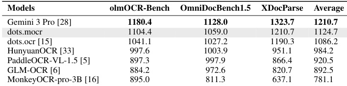 The authors compare the Elo performance of various vision-language models across three document parsing benchmarks. The results show that while Gemini 3 Pro achieves the highest scores, dots.mocr demonstrates superior performance among the listed open-source models. dots.mocr achieves the highest average Elo rating among the open-source models evaluated. The models are compared using an Elo-style paired comparison protocol across olmOCR-Bench, OmniDocBench1.5, and XDocParse. Gemini 3 Pro maintains the top ranking across all three individual benchmarks.