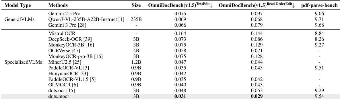 The authors compare various general-purpose and specialized vision-language models across several document parsing benchmarks. Results show that the specialized dots.mocr model achieves competitive performance, particularly excelling in specific metrics related to text editing and reading order compared to other specialized models. The dots.mocr model demonstrates superior performance in text editing tasks among the specialized models evaluated. Specialized VLMs generally outperform or match general-purpose VLMs in specific document parsing metrics. Results indicate that dots.mocr achieves high scores in reading order and text editing benchmarks relative to other specialized competitors.