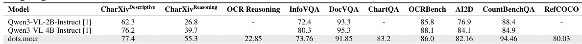 The authors evaluate the general vision-language capabilities of dots.mocr across a variety of document understanding and multimodal reasoning benchmarks. Results show that dots.mocr maintains highly competitive performance compared to strong general-purpose baseline models. dots.mocr demonstrates clear advantages in CharXiv tasks involving both descriptive and reasoning settings The model achieves strong results in downstream document VQA and chart understanding tasks Performance remains robust across broad visual grounding and reasoning benchmarks