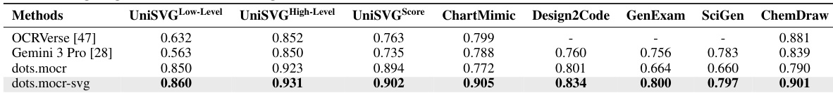 The authors evaluate structured graphics parsing performance across several visual domains using reconstruction-based metrics. Results show that dots.mocr-svg achieves the highest overall reconstruction score and outperforms both the open-source baseline and the closed-source Gemini 3 Pro on most downstream benchmarks. dots.mocr-svg demonstrates superior performance in general vector graphics reconstruction compared to other tested methods. The model shows significant advantages in structure-sensitive tasks such as chart mimicry and chemistry diagram reconstruction. The specialized svg version of the model consistently achieves higher scores across most layout and scientific figure benchmarks.