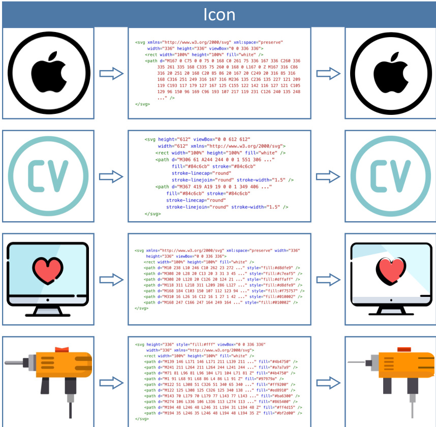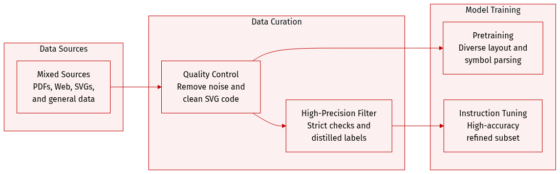 • SVG Processing: A two-stage pipeline is used for SVG assets. First, cleaning via svgo removes metadata and standardizes code. Second, deduplication is performed using textual matching and perceptual hashing (pHash). Sampling is balanced by domain and SVG program complexity.