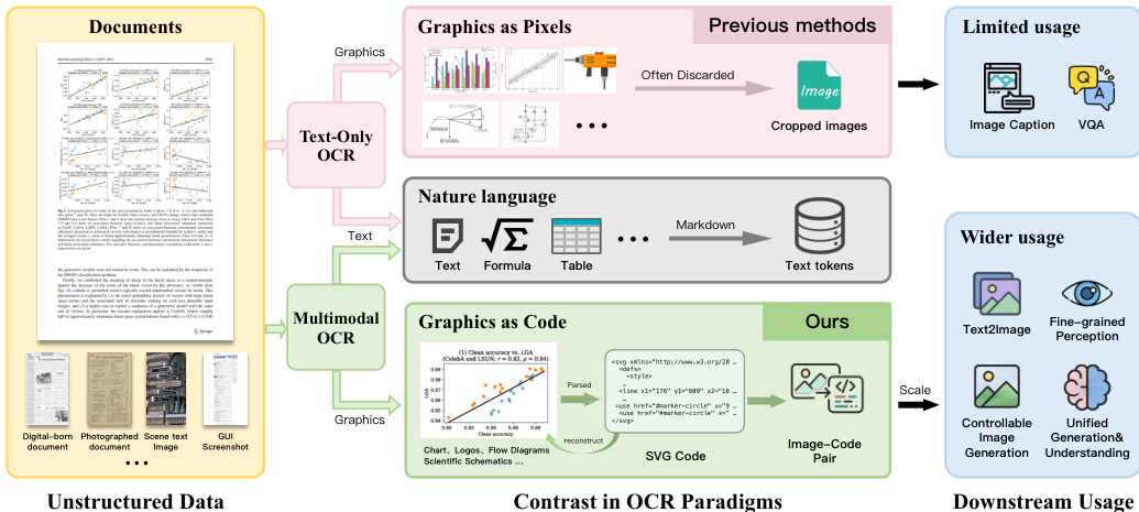 The MOCR framework is designed to unify diverse page-level parsing tasks, including document parsing, webpage and UI parsing, scene-text parsing, and structured graphics parsing, into a single cohesive model. By recovering not only text but also visual symbols as reusable, renderable code such as SVG, the authors transform documents and screens into a rich data engine. This approach enables scalable supervision for pretraining and retrieval that extends beyond simple raster crops.