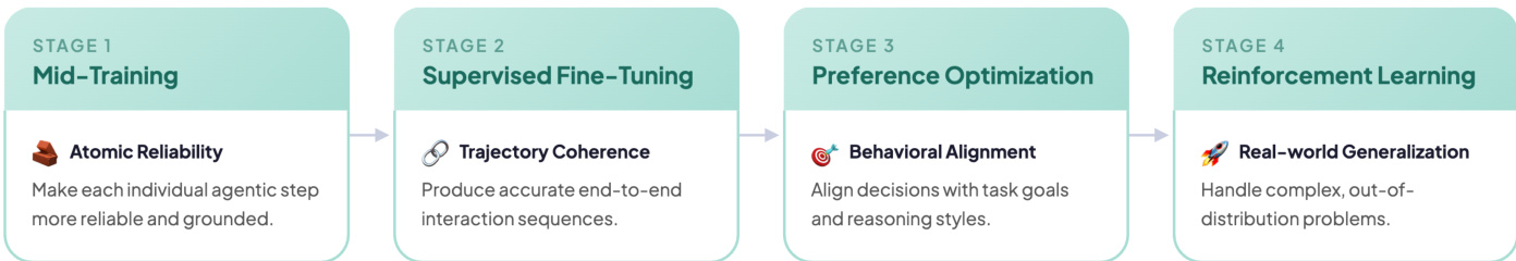 The training process follows a four-stage pipeline designed to progressively enhance agentic capabilities. First, Mid-Training strengthens atomic agentic capabilities such as planning, reasoning, and tool use through a large corpus of agentic supervision. Second, Supervised Fine-Tuning allows the model to learn structured agentic interaction behaviors by replicating expert trajectories. Third, Preference Optimization aligns the model's decisions with task objectives and behavior preferences. Finally, Reinforcement Learning promotes creative exploration and improves generalization in real-world environments using Group Relative Policy Optimization (GRPO).