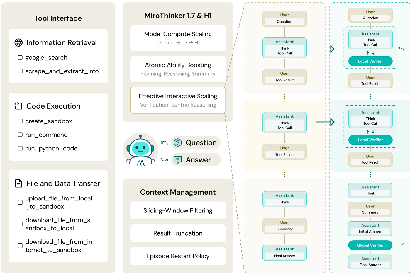 This interface encompasses Information Retrieval (search and scraping), Code Execution (sandboxed Python and shell commands), and File Transfer utilities. For the MiroThinker-H1 variant, the architecture incorporates a verification-centric reasoning scheme featuring Local and Global Verifiers to audit step-level and complete reasoning processes respectively.