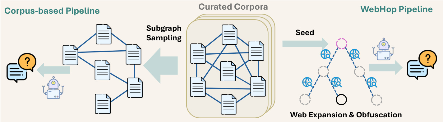 To support training, the authors employ a dual-pipeline QA synthesis framework. The Corpus-based Pipeline focuses on topical breadth by sampling subgraphs from curated corpora to generate high-volume QA pairs. In parallel, the WebHop Pipeline constructs calibrated reasoning trees using web-augmented expansion and hierarchical verification. This pipeline ensures reasoning rigour by expanding root entities via live web search and applying adaptive leaf obfuscation to prevent answer leakage.