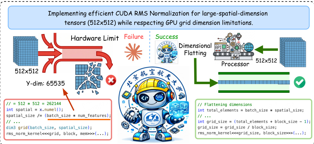 To ensure practicality in industrial settings, the authors replicate real-world engineering environments. For instance, in GPU optimization, the system handles hardware limitations by employing dimensional flattening techniques when standard grid dimensions are exceeded. This is demonstrated in the implementation of efficient CUDA RMS Normalization for large-spatial-dimension tensors, where the system successfully navigates hardware limits to produce valid code.