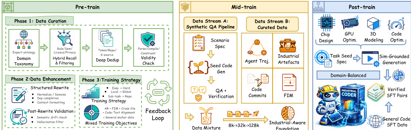 The authors develop InCoder-32B, a decoder-only Transformer architecture designed for industrial code intelligence. The training process is structured into three distinct phases: Pre-train, Mid-train, and Post-train, as illustrated in the framework diagram below.