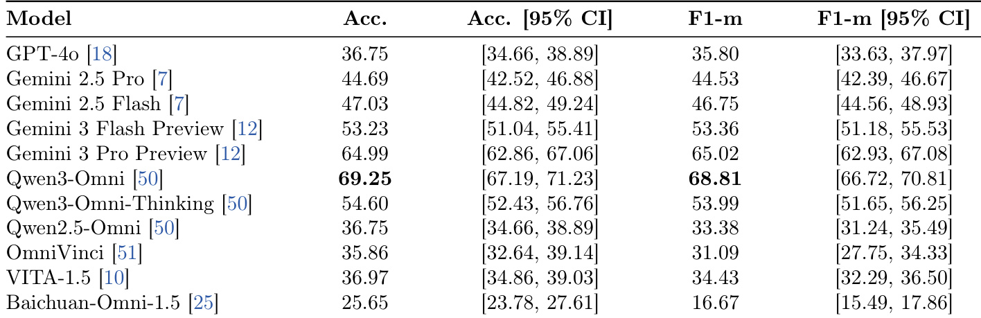 The the the table presents evaluation results for the speaker identification task, comparing accuracy and macro-F1 scores across various omni-modal models. Qwen3-Omni achieves the highest performance metrics, surpassing commercial models like Gemini 3 Pro Preview and GPT-4o. There is a clear distinction in capability, with top models significantly outperforming lower-ranked open-source alternatives. Qwen3-Omni leads the comparison with the highest accuracy and macro-F1 scores. Commercial models generally perform well but do not surpass the top open-source model. Performance varies widely, with some models scoring substantially lower than the leaders.