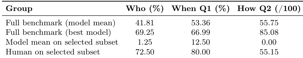 The authors present a comparison between model performance on a full benchmark and human performance on a challenging selected subset. Humans demonstrate significantly higher accuracy than the average model on the selected subset for speaker identification and timing control. Although top models on the full benchmark score higher on response quality than humans on the subset, they still fall short of human performance in perception and timing tasks. Humans significantly outperform the average model on the selected subset across all three evaluation axes. The best models on the full benchmark achieve higher generation quality scores than humans on the selected subset but underperform humans on perception and timing. Model performance degrades drastically on the selected subset compared to the full benchmark, highlighting specific weaknesses in handling difficult scenarios.