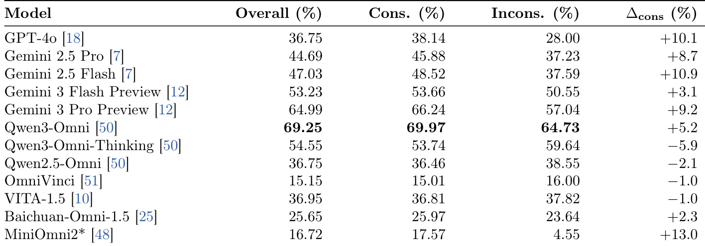 The the the table presents speaker identification accuracy for various omni-modal models, separating performance on clips with consistent audio-visual cues from those with inconsistent cues. It highlights the consistency gap to measure model robustness when visual and audio signals conflict. Qwen3-Omni achieves the highest overall accuracy and consistency rates, outperforming both commercial APIs and open-source alternatives. MiniOmni2 exhibits the largest consistency gap, indicating it is highly sensitive to cross-modal misalignment compared to other models. Qwen3-Omni-Thinking shows a negative consistency gap, performing worse on consistent clips than on inconsistent ones, suggesting reasoning overhead may hinder simple perception tasks.