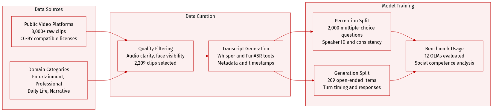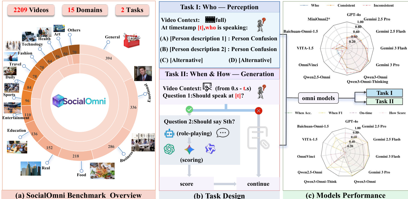 - SocialOmni features 2,000 perception samples and a quality-controlled diagnostic set of 209 interaction-generation instances with strict temporal and contextual constraints. The dataset includes controlled audio-visual inconsistency scenarios to test model robustness against multimodal conflicts.