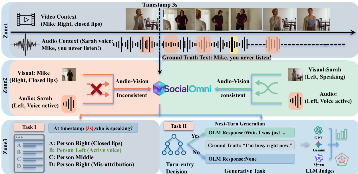 Omni-modal large language models integrate audio, vision, and text to support real-time multimodal conversation where success depends on interaction competence like turn timing and social coherence rather than just factual accuracy. Existing benchmarks focus on static accuracy and fail to assess coherent understanding across multi-turn dialogues. Prior behavior-centric work often isolates single facets without evaluating perception and social appropriateness simultaneously. To close this gap, the authors introduce SocialOmni to evaluate social interactivity across speaker identification, turn timing, and interruption generation. They also propose a dual-axis protocol to decouple perception from generation and design probes to quantify robustness under audio-visual conflicts.