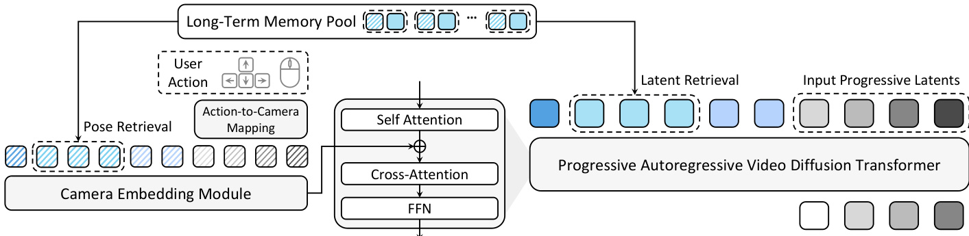 Refer to the framework diagram below for an overview of the system architecture, which integrates action-to-camera mapping, camera-controlled generation, and a pose-anchored memory mechanism.