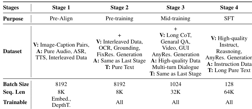 The the the table outlines a four-stage training curriculum for a unified omni-modal system, progressing from initial alignment to specialized instruction tuning. The methodology systematically increases sequence length and data complexity while reducing batch sizes as the model moves from pre-training to supervised fine-tuning. The training process begins with pre-alignment using basic image and audio data before expanding to include OCR, grounding, and interleaved text in the pre-training stage. Sequence length capabilities are progressively scaled up from the initial stages to the final fine-tuning phase to support long-context reasoning and generation. Full parameter training is activated in the later stages, whereas the initial alignment phase focuses on updating only specific embedding and depth components.
