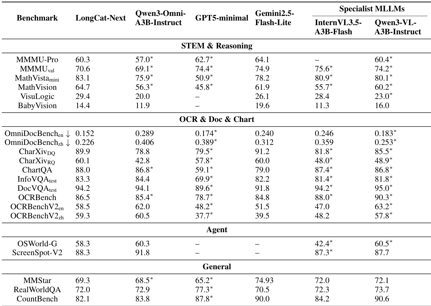 The authors evaluate LongCat-Next against state-of-the-art unified and specialist models across diverse benchmarks including STEM, OCR, and general visual understanding. The results demonstrate that the model achieves leading performance in mathematical reasoning and document analysis, often outperforming dedicated vision-language models and other omni-modal systems. Additionally, the model maintains competitive capabilities in agent tasks and general visual question answering, validating its robustness across multiple modalities. The model secures top rankings in mathematical reasoning benchmarks, surpassing specialist vision-language models on tasks involving complex logic and math. Performance on document understanding and OCR benchmarks is superior to baselines, indicating strong fine-grained text perception capabilities. General visual understanding scores are highly competitive, with the model leading on specific benchmarks like MMStar and RealWorldQA.