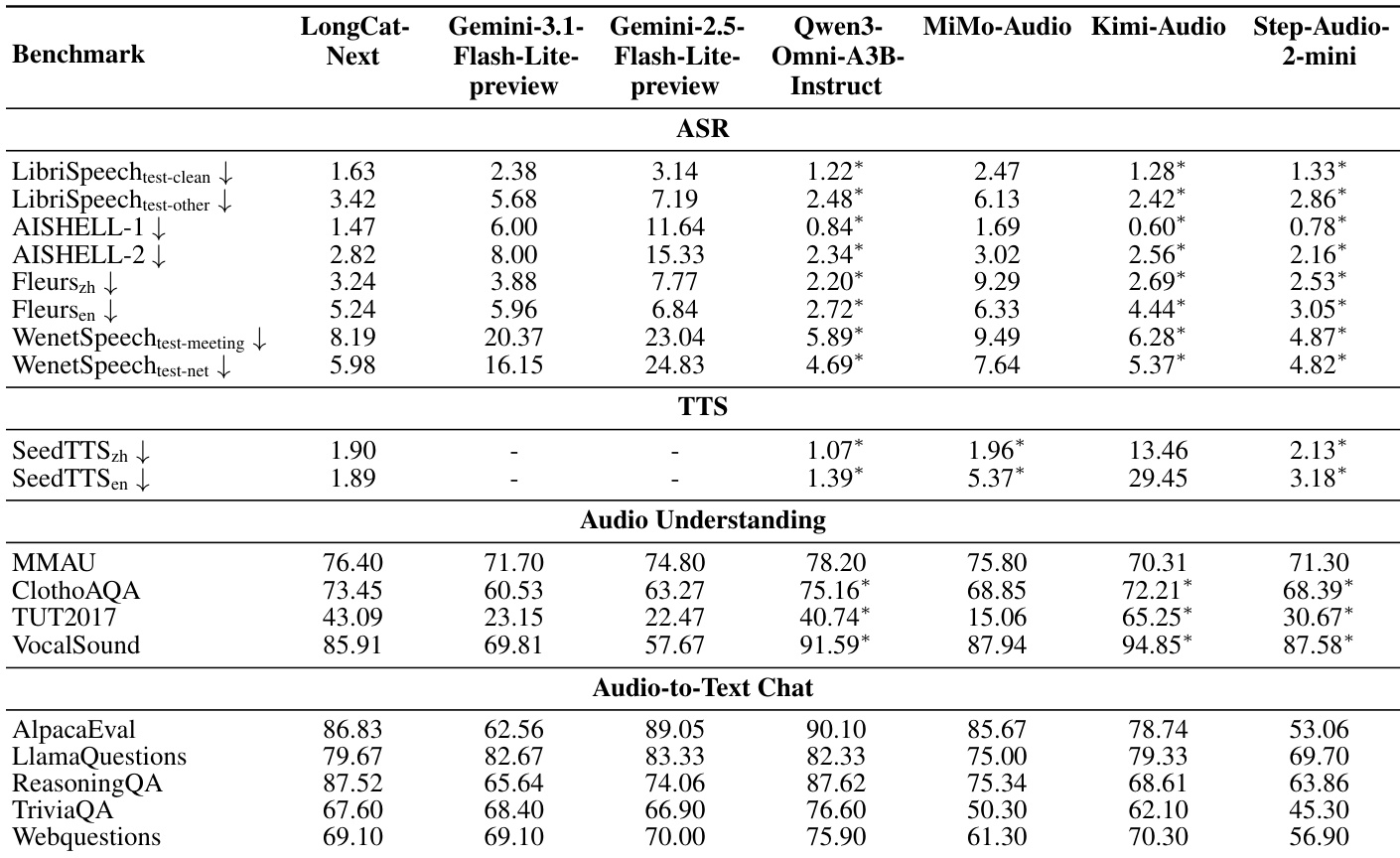 The the the table presents a comprehensive evaluation of LongCat-Next's audio capabilities against leading multimodal and specialized models across speech recognition, synthesis, understanding, and chat tasks. LongCat-Next demonstrates significant advantages over the Gemini series in speech recognition and synthesis tasks, consistently achieving lower error rates. While it remains competitive with top-tier baselines in reasoning and chat capabilities, it generally records higher error rates in ASR and lower scores in audio understanding compared to specialized models like Kimi-Audio and Qwen3-Omni. LongCat-Next achieves substantially lower error rates than Gemini models in automatic speech recognition across all tested datasets. In text-to-speech synthesis, the model outperforms MiMo-Audio and Step-Audio-2-mini, particularly on English benchmarks. The model demonstrates strong reasoning capabilities in audio-to-text chat, closely matching the performance of Qwen3-Omni on the ReasoningQA benchmark.