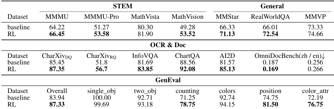 The authors evaluate a model's performance with and without Reinforcement Learning (RL) across STEM, OCR, and visual generation benchmarks. The results indicate that incorporating RL consistently improves the model's capabilities in reasoning, document understanding, and image generation tasks compared to the baseline. Reinforcement Learning enhances performance across STEM benchmarks, showing gains in mathematical and multi-disciplinary reasoning. The RL variant achieves superior results in OCR and document tasks, particularly for chart question answering and information extraction. Visual generation capabilities improve overall, with the RL model outperforming the baseline in general alignment and complex attribute tasks.
