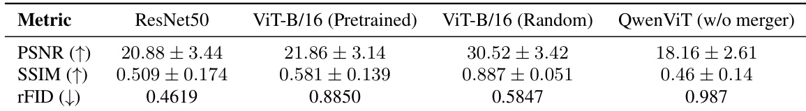 The experiment evaluates the reconstruction capabilities of various visual encoders, including ResNet50, ViT variants, and QwenViT, using fidelity and perceptual metrics. Results indicate that a randomly initialized ViT achieves the highest pixel-level accuracy, while the ResNet50 model demonstrates the best perceptual quality. In contrast, the QwenViT encoder without the merger module exhibits the lowest performance across all measured dimensions. Randomly initialized ViT-B/16 achieves superior pixel-level reconstruction fidelity compared to pretrained or semantic encoders. ResNet50 maintains the strongest perceptual quality, outperforming other architectures in distribution similarity. The QwenViT encoder without the merger module shows the weakest reconstruction capabilities among the tested models.