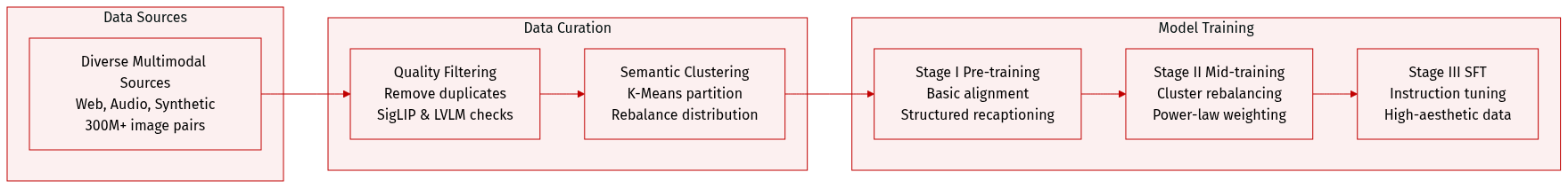 - Stage III Supervised Fine-Tuning: High-quality exemplars are selected from semantic clusters alongside high-aesthetic and text-rich subsets to align with complex human instructions.