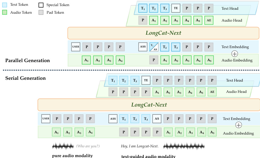 In parallel generation, text and audio tokens are generated simultaneously with a slight delay for alignment to eliminate response latency. In serial generation, the model produces the text segment first, followed by the audio segment, which simplifies the process and avoids conflicts between modality representations.