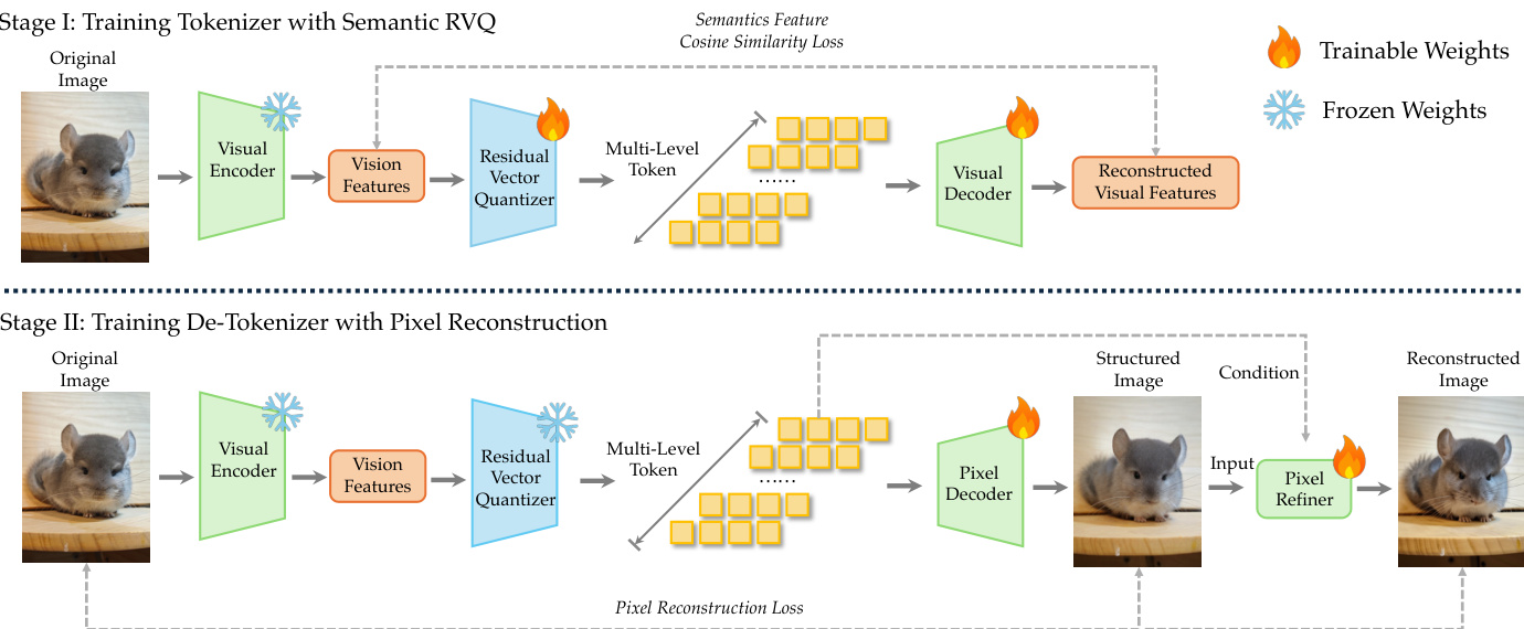r0=fproj(z),q^l=VQ(rl−1),rl=rl−1−q^l,z^=l=1∑Lq^lThe training of the vision tokenizer occurs in two stages. In Stage I, the model learns to map continuous features to discrete tokens using semantic alignment and RVQ. In Stage II, a pixel decoder is trained to reconstruct images from these discrete tokens, ensuring the representation retains sufficient information for generation. Refer to the visual reconstruction pipeline.