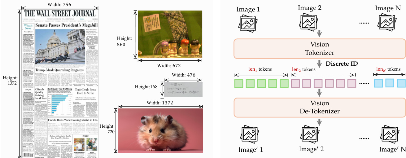 For visual processing, the system employs dNaViT, a Discrete Native-Resolution Vision Transformer. Unlike conventional encoders that rely on fixed resolutions, dNaViT operates on images at their native resolution to preserve spatial details and avoid information loss. The tokenization pipeline involves a Semantic-and-Aligned Encoder (SAE) followed by Residual Vector Quantization (RVQ). Refer to the tokenizer and de-tokenizer training pipeline.