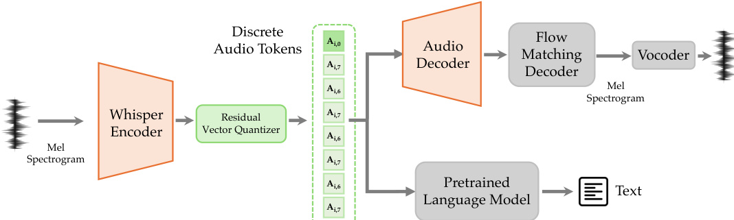 The resulting tokens are processed by two branches: a frozen pretrained language model for understanding and an audio decoder with a flow-matching module for synthesis. The training objective includes Mel spectrogram reconstruction loss, RVQ commit loss, and LLM loss for audio understanding: