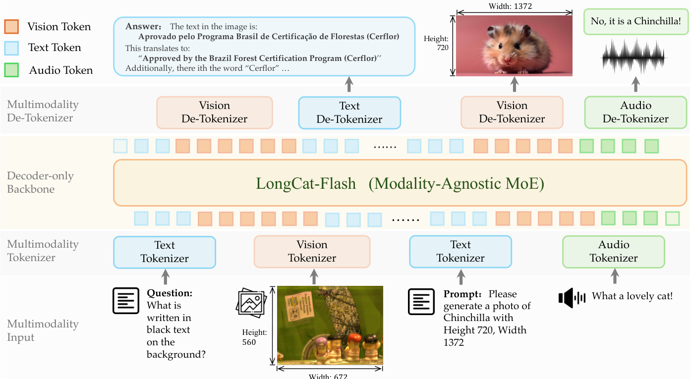 Laudio=λ1Lrecon+λ2Lcommit+λ3LllmThe backbone model, LongCat-Flash, is a Mixture-of-Experts (MoE) architecture that remains modality-agnostic. It supports both parallel and serial generation strategies for text-guided audio. Refer to the speech generation strategies.