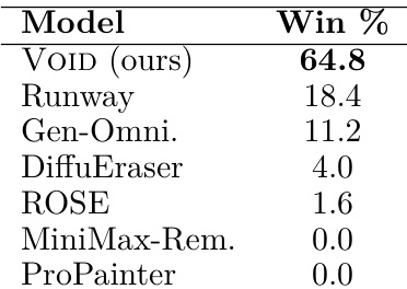 The authors conduct a human preference study to evaluate how realistically different models handle video object removal and its subsequent physical effects. Results show that the proposed VOID model is preferred by participants significantly more often than all other tested baselines. VOID achieves the highest win rate among all evaluated models in real-world scenarios The proposed method outperforms commercial text-guided editing systems Traditional inpainting and removal models receive minimal preference in comparison