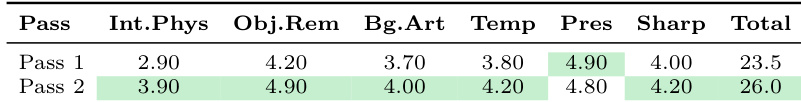 The authors conduct an ablation study to evaluate the impact of a two-pass video appearance refiner. Results show that applying a second pass improves performance across most evaluated criteria, including interaction and physics, object removal, and temporal consistency. The second pass leads to higher total scores compared to the first pass Improvements are observed in the model's ability to handle interaction and physics The second pass enhances object removal and temporal consistency