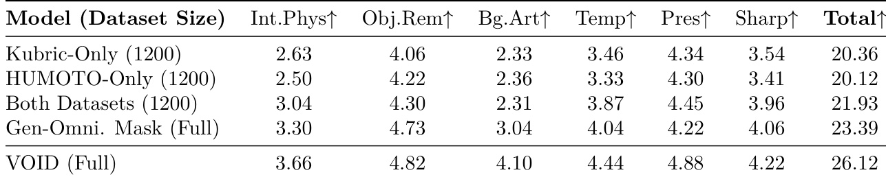The authors conduct an ablation study to evaluate the impact of dataset composition and masking strategies on model performance. Results show that combining multiple datasets and utilizing a detailed quadmask strategy significantly improves scores across all evaluated categories. Training on both Kubric and HUMOTO datasets yields better performance than using either dataset alone. The quadmask strategy outperforms the use of less detailed trimasks across all scoring criteria. The full VOID framework achieves the highest total score among all tested configurations.