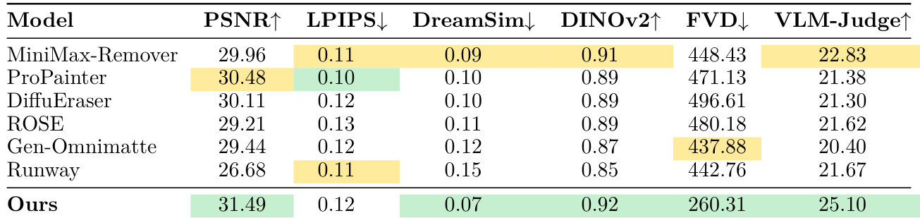 The authors evaluate their model against several baselines on a synthetic benchmark featuring shadow, reflection, and dynamic interaction removal. Results show that the proposed method achieves superior performance across most metrics, particularly in video-level and semantic evaluations. The proposed model demonstrates significant improvements in FVD and VLM-Judge scores compared to all baseline methods. The model achieves the highest scores in DINOv2 and PSNR among the compared approaches. While the model excels in most categories, it does not achieve the lowest LPIPS score, which the authors attribute to the metric's sensitivity to local spatial translations.