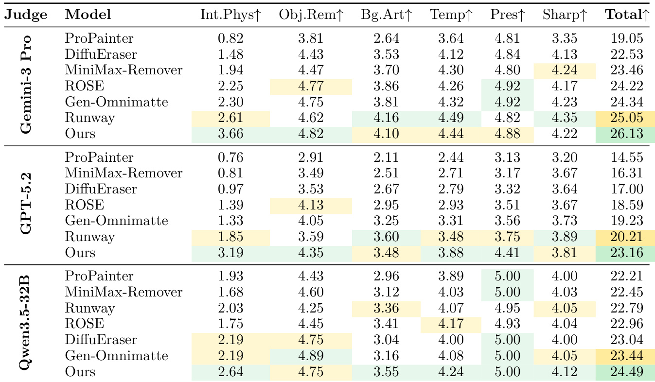 The authors evaluate their model against several baselines using three different vision-language model judges on real-world video editing tasks. Results show that the proposed method achieves the highest total scores across all judges, demonstrating superior performance in handling physical interactions and object removal. The proposed model outperforms all baselines in the total score category across all three vision-language judges. The model shows significant advantages in modeling physical interactions and object removal compared to existing methods. The performance gains are consistent across different automated judges, including Gemini Pro, GPT-5.2, and Qwen-3.5-32B.