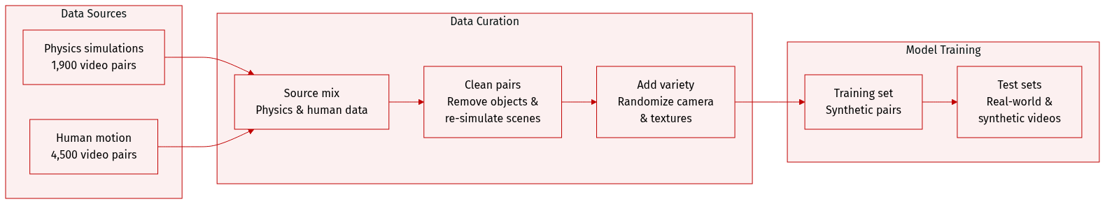 • Rigid-body dynamics (Kubric): The authors generate approximately 1,900 video pairs using physics-based simulations. These videos simulate collisions, falling, and structural dependencies by sampling various initial positions and velocities for multiple objects.