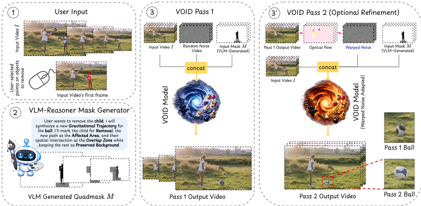 Video object removal is essential for high-quality video editing, yet existing methods primarily focus on inpainting pixels behind an object or correcting photometric effects like shadows and reflections. These current approaches fail when the removed object is involved in complex physical interactions, such as collisions or supporting other items, often resulting in physically implausible scenes. The authors introduce VOID, a framework designed to perform physically plausible inpainting by synthesizing counterfactual video outcomes. They leverage a vision-language model to identify affected regions and use a video diffusion model to generate consistent dynamics, supported by a new paired dataset of counterfactual object removals.