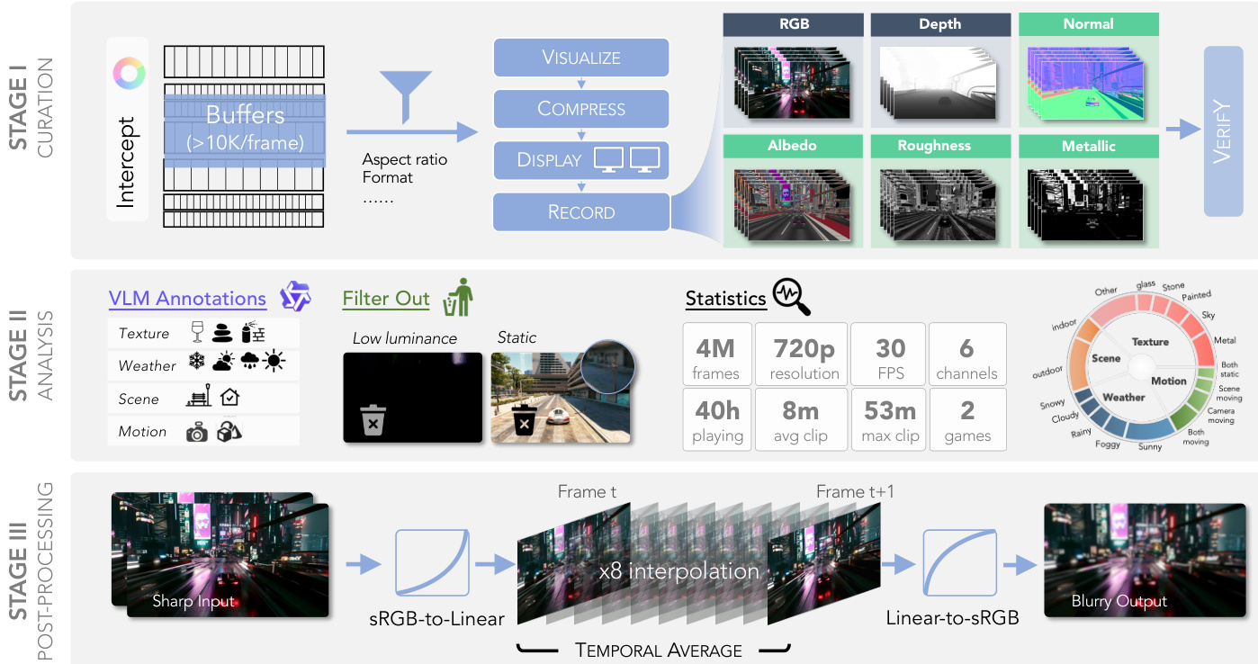 Dataset Composition and Sources The authors curate a large-scale, dynamic dataset from two visually complex AAA games: Cyberpunk 2077 and Black Myth: Wukong. This collection bridges the domain gap between synthetic and real-world data by providing 4 million continuous frames at 720p resolution and 30 FPS. The dataset uniquely pairs synchronized RGB video with five high-fidelity G-buffer channels (depth, normals, albedo, metallic, and roughness) across diverse environments, including urban and natural scenes under varying weather conditions like rain, fog, and snow.