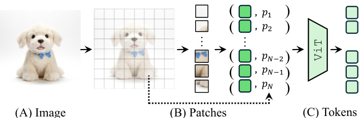 Image Tokenization The foundation of this method lies in how images are represented within ViT-based MLLMs. An input image I is partitioned into a fixed grid of non-overlapping patches. Each patch is processed by a shallow encoder and a vision encoder (e.g., ViT) to produce a sequence of image tokens. These tokens function as perceptual atoms, encoding both semantic content and positional information at the patch level.