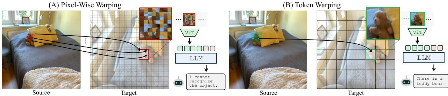 Warping Strategy To transform the scene to a new viewpoint, the system must map tokens from the source image to the target view. The authors compare pixel-wise warping with token warping. Pixel-wise warping retrieves individual pixels for target coordinates, but the subsequent patchification of the warped image often introduces local distortions that confuse the MLLM. In contrast, token warping retrieves intact tokens from the source view, preserving semantic consistency.