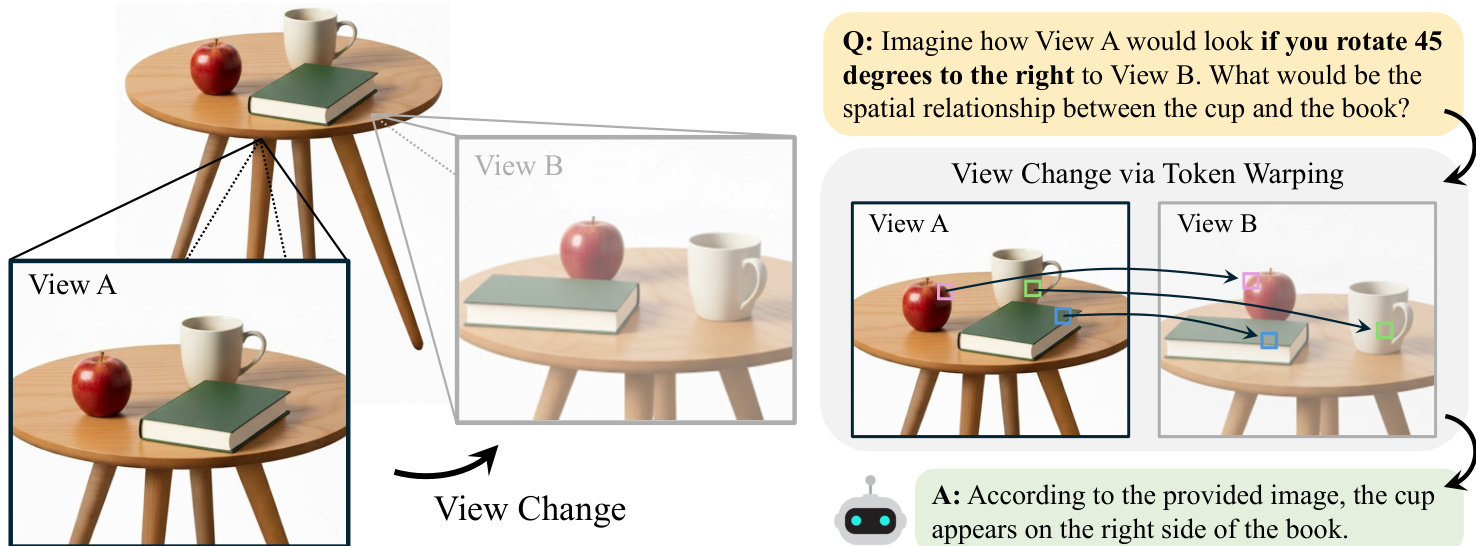 This setup evaluates the model's ability to handle view changes robustly, such as determining if an object is to the left or right of another from a different angle, or describing object properties visible in the warped target view. By leveraging token warping, the system effectively transfers perceptual information across viewpoints without the degradation associated with pixel-level manipulation.