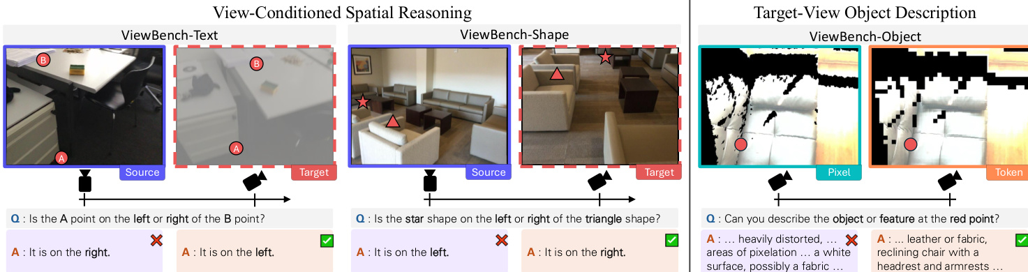 - ViewBench-Text: Contains 571 samples where two co-visible points are annotated with alphabet labels (A/B) to test binary left-right spatial reasoning.