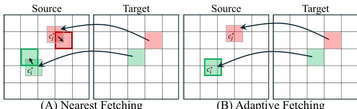 Token Fetching Mechanisms A critical design choice involves how to fetch tokens from the source image at the mapped coordinates, which often fall between the original grid centers. The authors explore two strategies: Nearest Fetching and Adaptive Fetching.