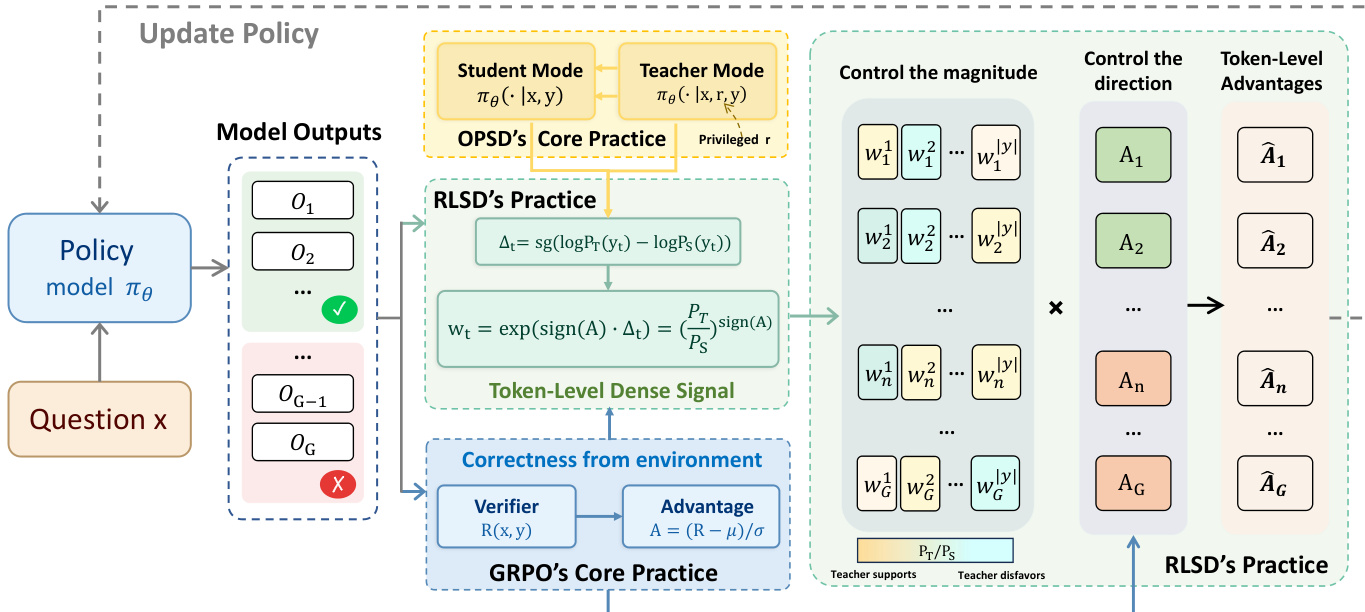 Large reasoning models increasingly rely on Reinforcement Learning with Verifiable Rewards (RLVR) to optimize against checkable outcomes, yet this approach suffers from sparse sequence-level signals that fail to distinguish critical reasoning steps from filler tokens. While On-Policy Self-Distillation (OPSD) attempts to solve this by using a model's own privileged outputs as dense training signals, it introduces a fatal information asymmetry where the student learns to leak reference answers it cannot access during inference, causing performance to degrade after initial gains. The authors address this by proposing RLSD, a paradigm that decouples update direction from update magnitude by anchoring gradient directions to reliable environment rewards while using self-distillation solely to modulate the fine-grained intensity of token-level updates.
