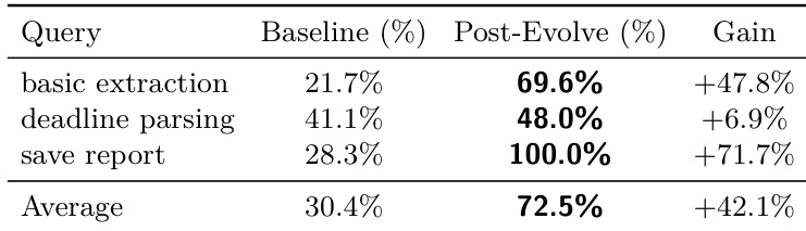 The the the table presents performance gains across three custom queries after a single round of skill evolution. Results show significant improvements in baseline performance, with the largest gains observed in basic extraction and save report tasks. Performance improvements are most pronounced in tasks involving procedural knowledge gaps. The average gain across all queries exceeds 40%, indicating consistent effectiveness of skill evolution. Save report achieves a perfect score after evolution, highlighting resolution of specific environmental failures.