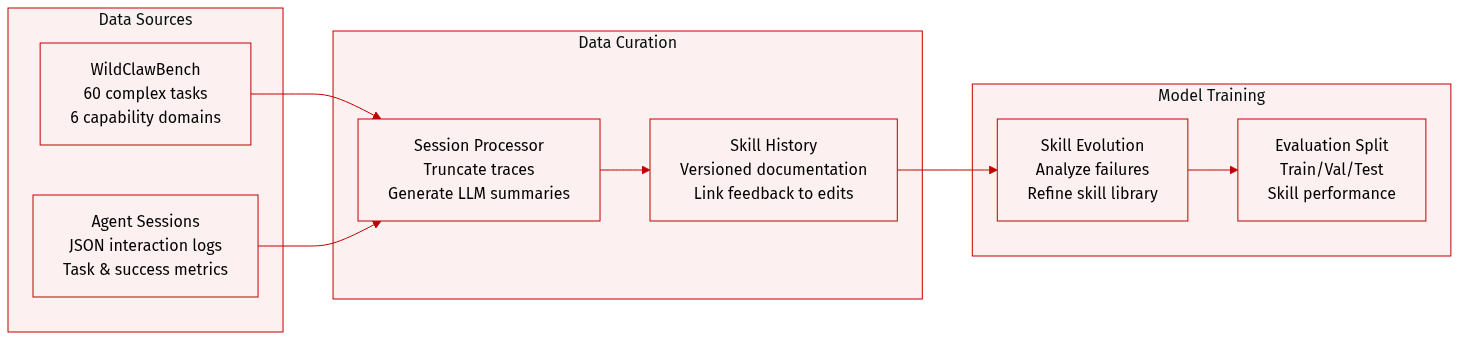 The authors utilize a specialized data framework centered around WildClawBench and a structured agent session repository to drive skill evolution. The dataset composition and processing details are as follows: